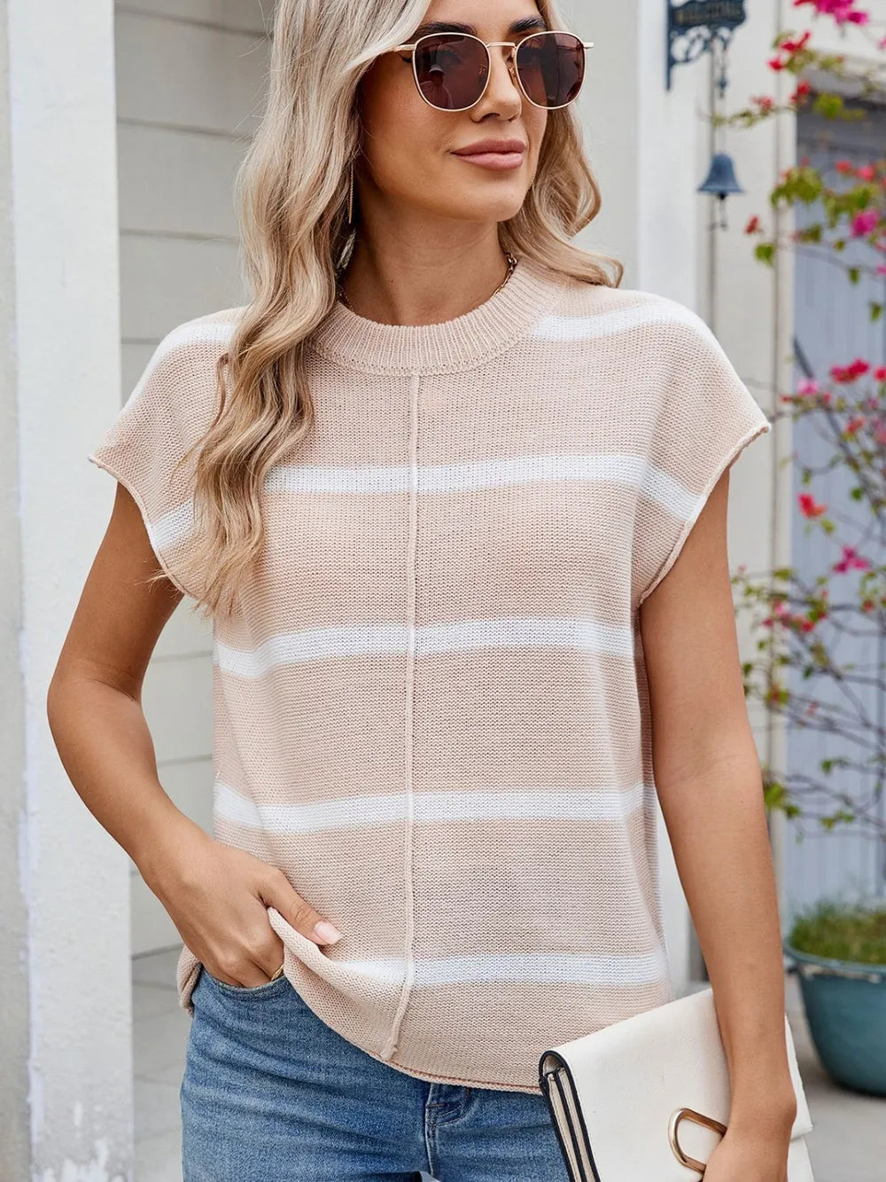 Exposed Seam Striped Round Neck Knit Top