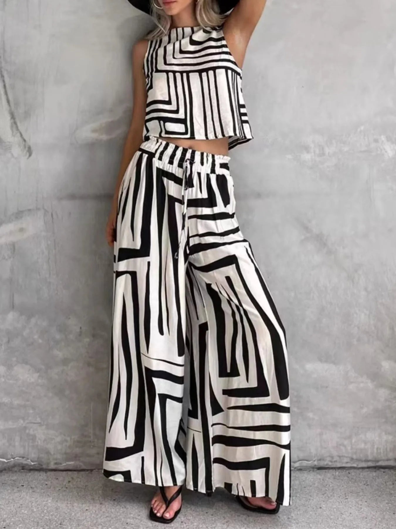 Geometric Print Sleeveless Top and Wide Leg Pants Set
