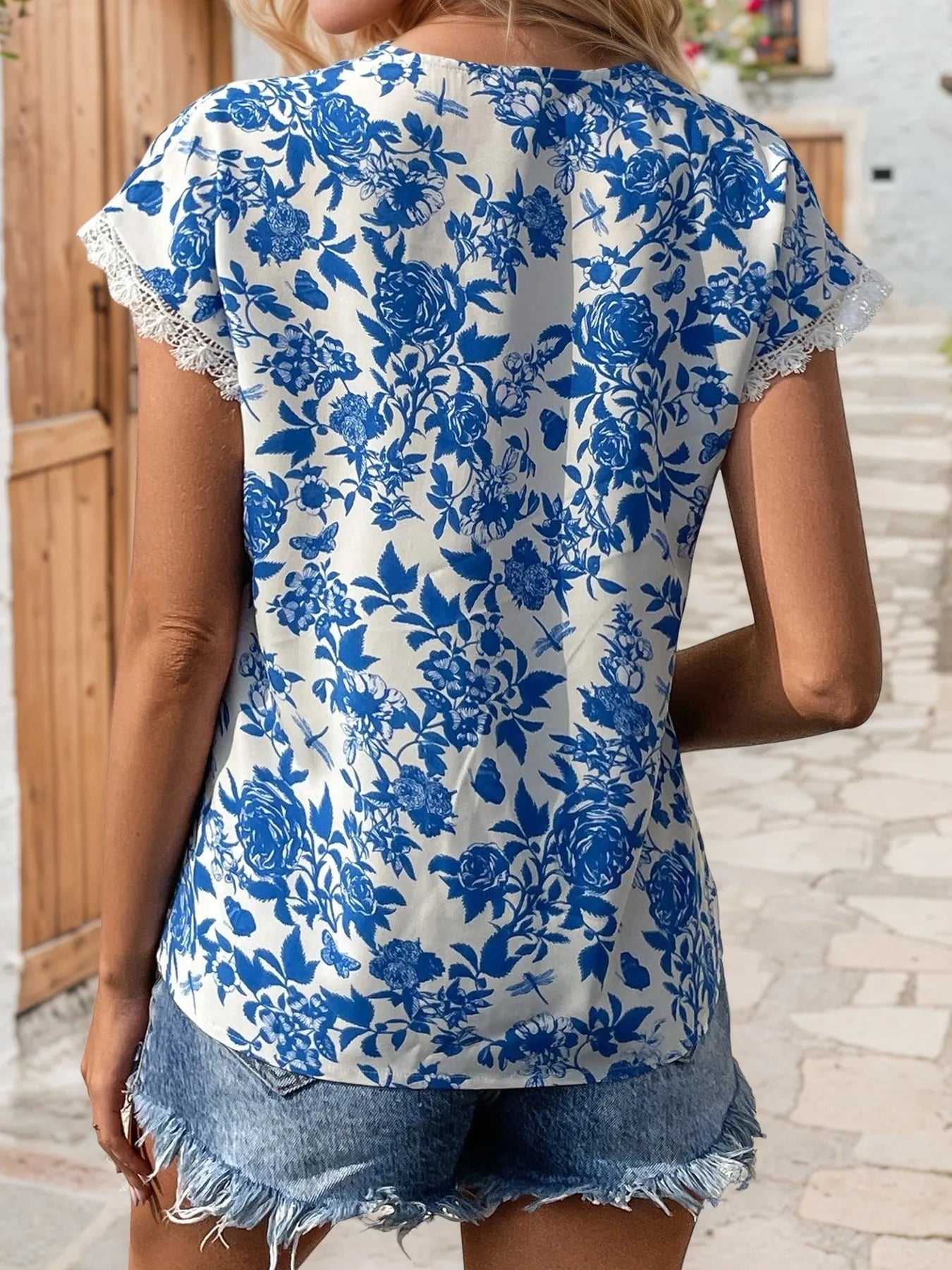 Lace Detail Printed Cap Sleeve Blouse
